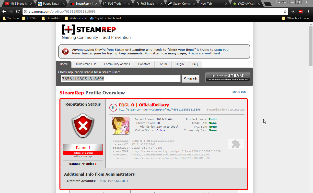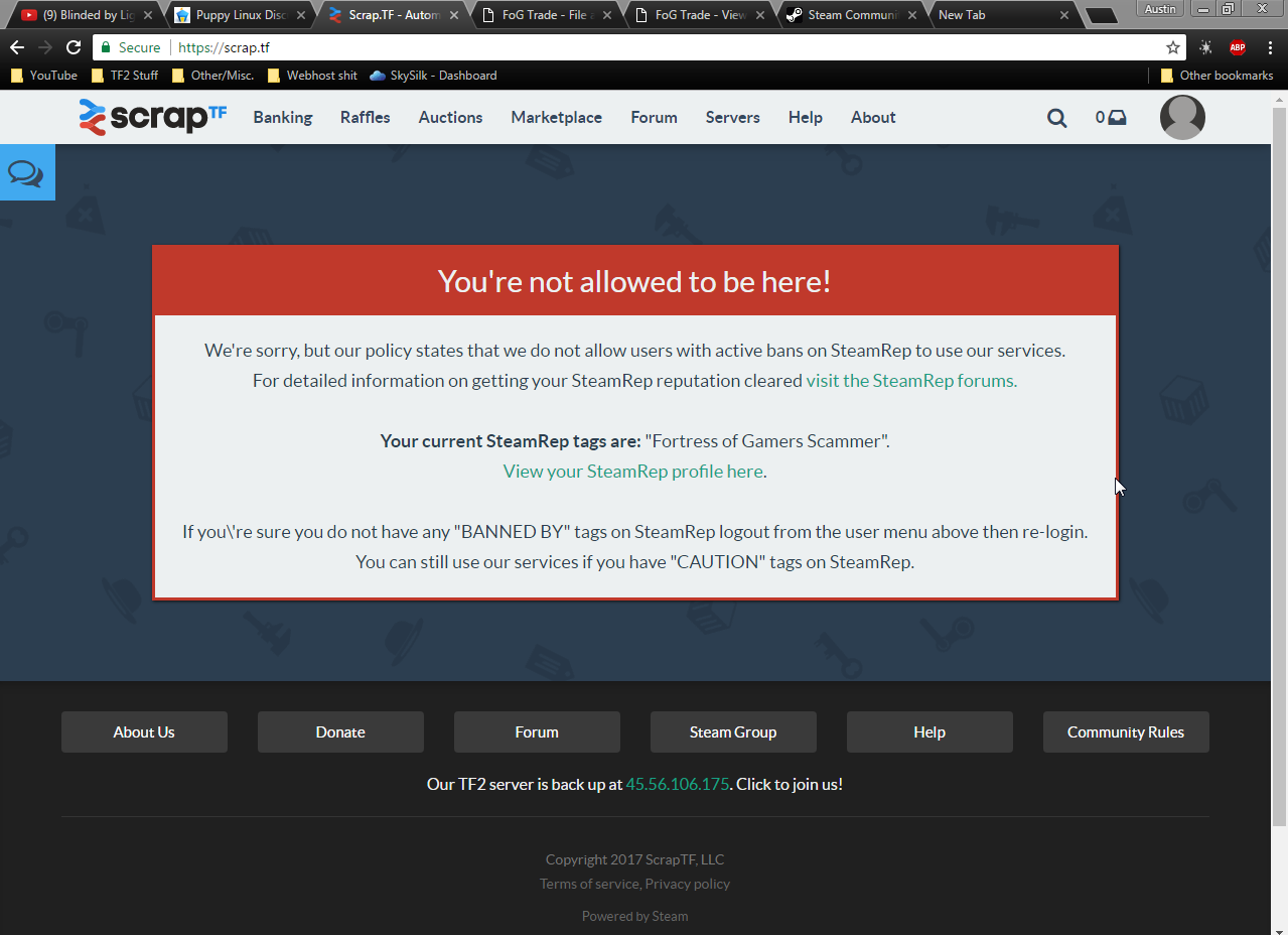 I was attempting to go on scrap.tf to do my usual stuff such as get a weapon that i wanted, when i was greeted with an error (will attach file in appeal here) and then i went to view my steamrep page which listed that i was banned and why and it said the account on the page there was an alt account, when its not (its my brothers own account, i have nothing to do with it, nor do i have access to it.) i read up on his report on the following page: