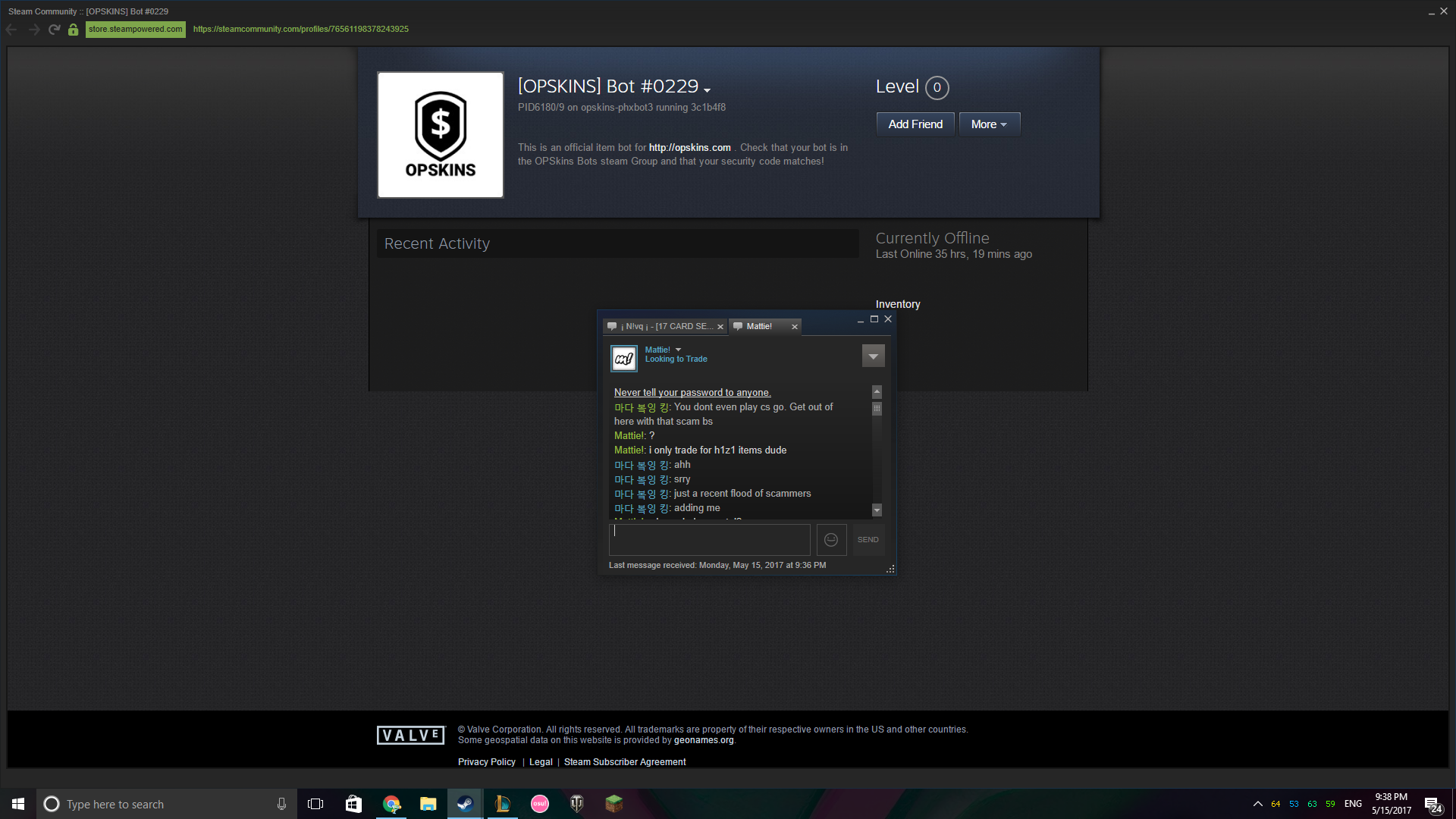 Tried to scam linked his profile inv with the real Mattie's. Failed to scam me using a very obvious scam. After being accused of scamming and impersonating tried to act innocent. Plz Give ban Hammer.